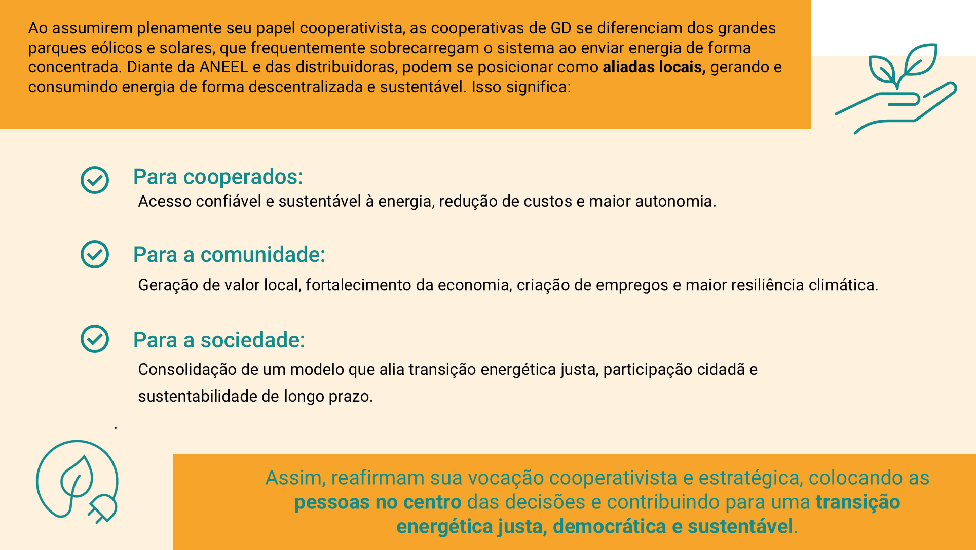 Ao assumirem plenamente seu papel cooperativista, as cooperativas de GD se diferenciam dos grandes parques eólicos e solares, que frequentemente sobrecarregam o sistema ao enviar energia de forma concentrada. Diante da ANEEL e das distribuidoras, podem se posicionar como aliadas locais, gerando e consumindo energia de forma descentralizada e sustentável.