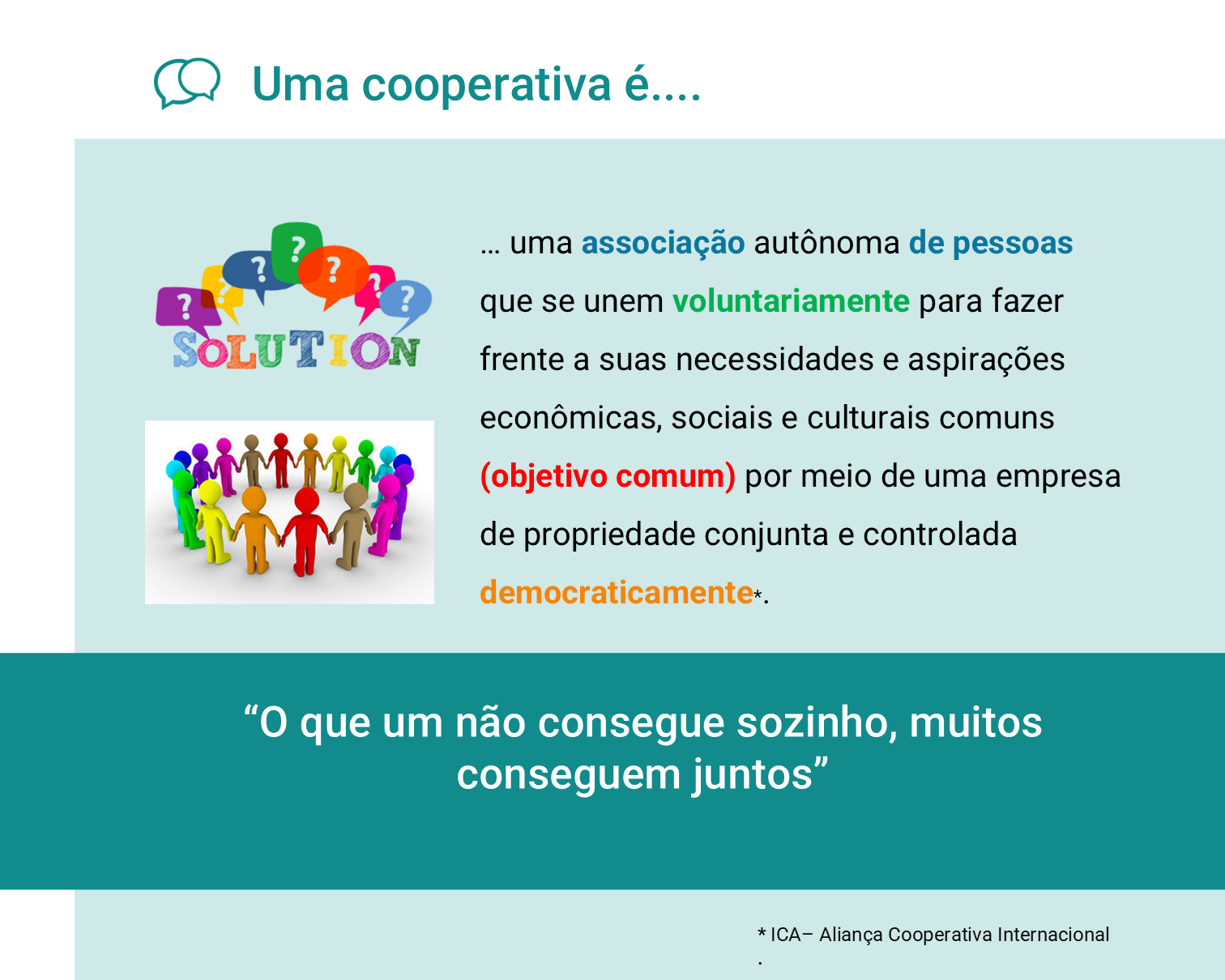 Segundo a ICA – Aliança Cooperativa Internacional, uma cooperativa é uma associação autônoma de pessoas que se unem voluntariamente para atender às suas necessidades e aspirações econômicas, sociais e culturais comuns, por meio de uma empresa de propriedade coletiva e gestão democrática.
