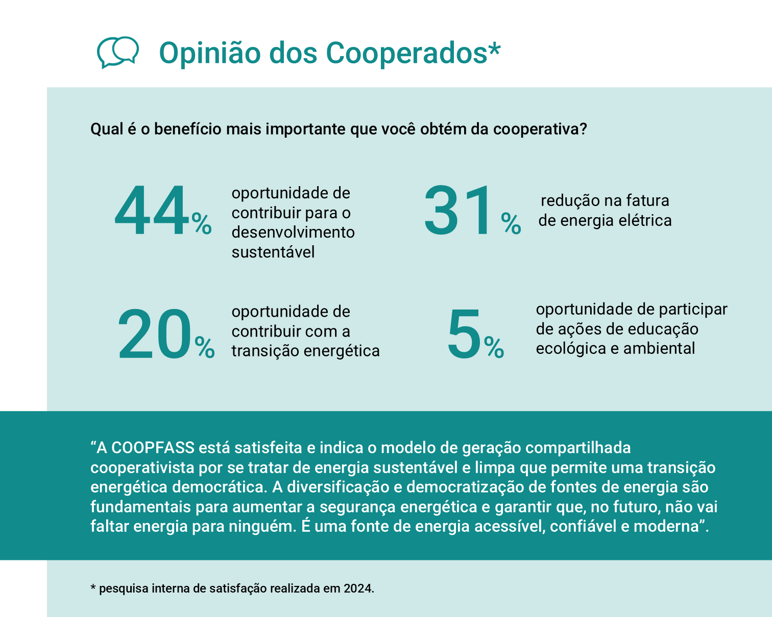 Com 20 cooperados — sendo 60% das famílias lideradas por mulheres — a COOPFASS abastece nove unidades consumidoras e impacta diretamente 26 pessoas. A cooperativa opera no modelo de prossumidor, no qual os associados são simultaneamente geradores e consumidores de energia. Nesse sistema, cada cooperado realiza um investimento proporcional ao seu consumo e recebe créditos equivalentes em sua conta de luz.