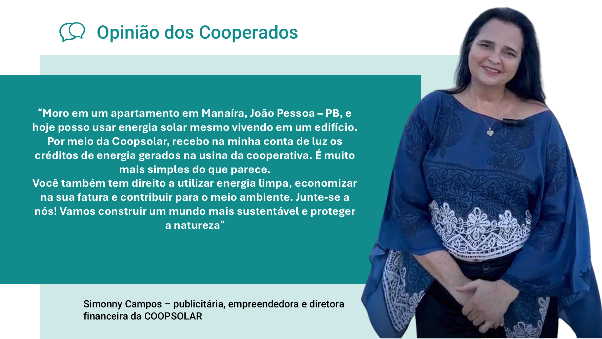 Simonny Campos, publicitária e empreendedora, vive em um apartamento no bairro Manaíra, João Pessoa. Membro do conselho administrativo e responsável pela gestão financeira da Coopsolar. “Moro em um apartamento em Manaíra, João Pessoa – PB, e hoje posso usar energia solar mesmo vivendo em um edifício. Por meio da Coopsolar, recebo na minha conta de luz os créditos de energia gerados na usina da cooperativa. É muito mais simples do que parece. Você também tem direito a utilizar energia limpa, economizar na sua fatura e contribuir para o meio ambiente. Junte-se a nós! Vamos construir um mundo mais sustentável e proteger a natureza”.