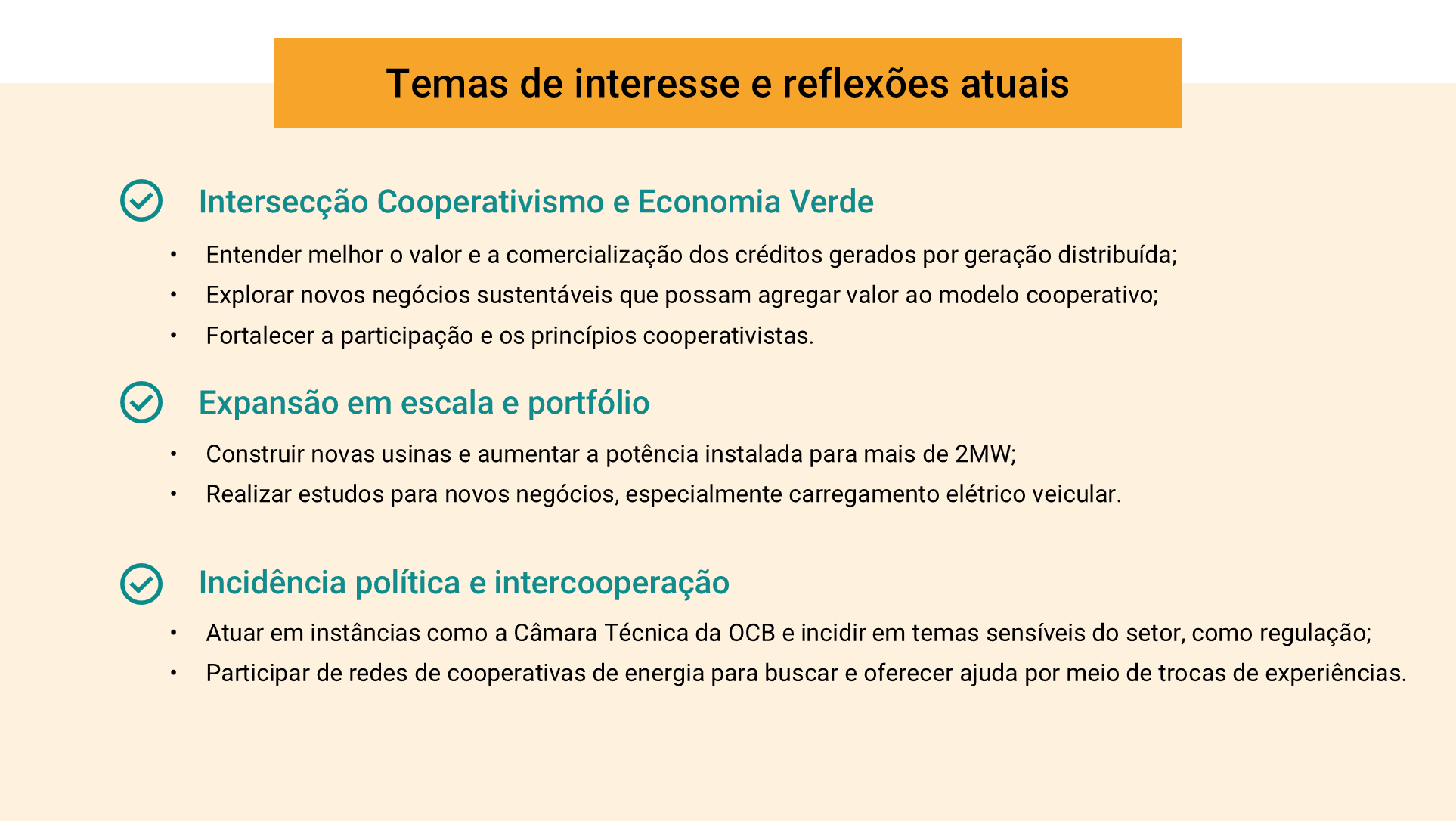 “Para o futuro, queremos ampliar as operações com crescimento da base de cooperados e novos negócios no portfólio, como carregamento elétrico”, conta Eduardo. “Queremos explorar as oportunidades de negócios na intersecção cooperativismo e economia verde. Para isso precisamos de avanços na regulação, então procuramos incidir nas políticas públicas para a geração descentralizada participando de redes e de iniciativas de intercooperação”.