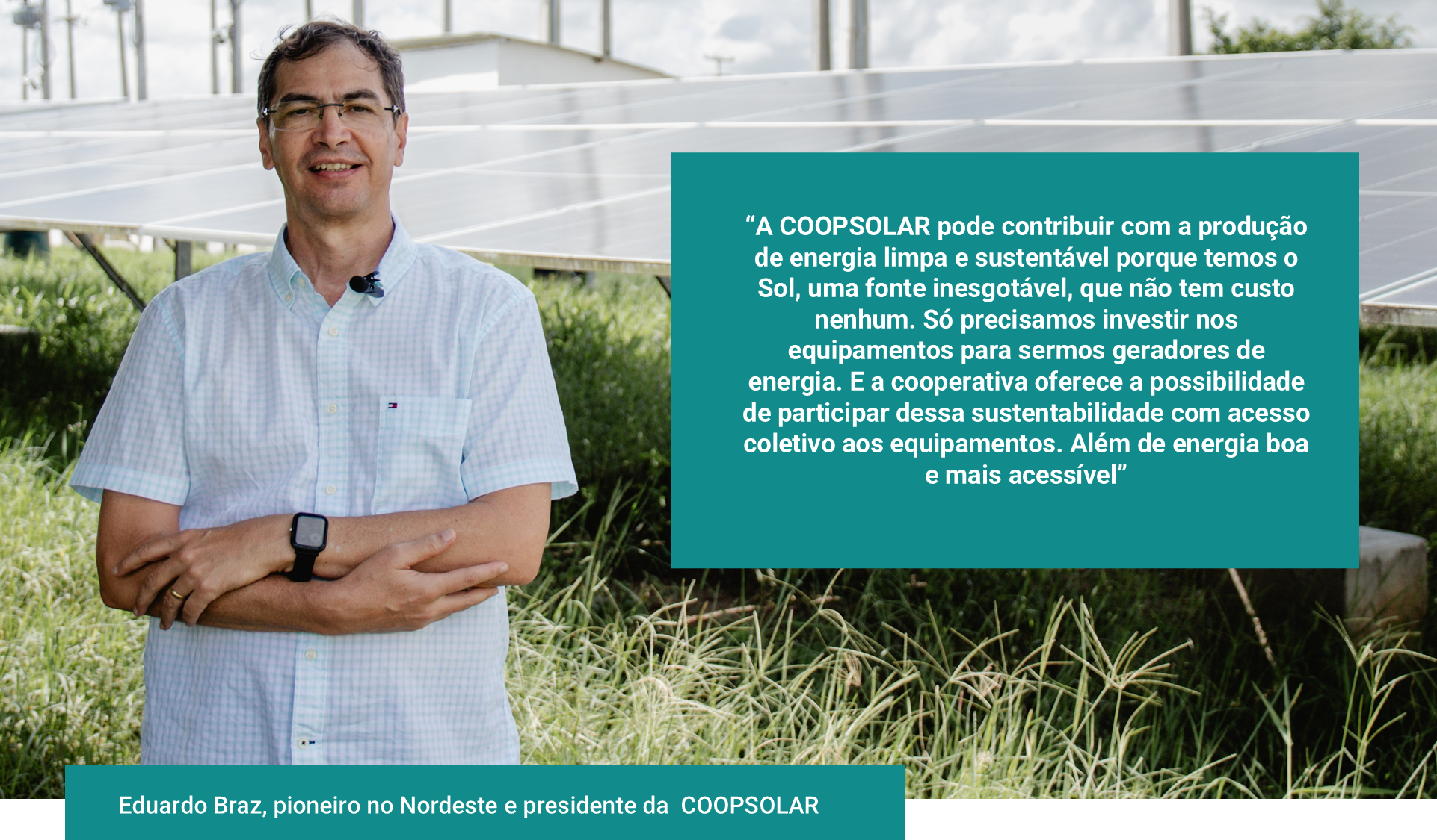 “A COOPSOLAR pode contribuir com a produção de energia limpa e sustentável porque temos Sol em abundância, uma fonte inesgotável, que não tem custo nenhum. Só precisamos investir nos equipamentos para sermos geradores de energia. E a cooperativa oferece a possibilidade de participar dessa sustentabilidade com acesso coletivo aos equipamentos. E os créditos se convertem em descontos em nossas faturas de energia”.